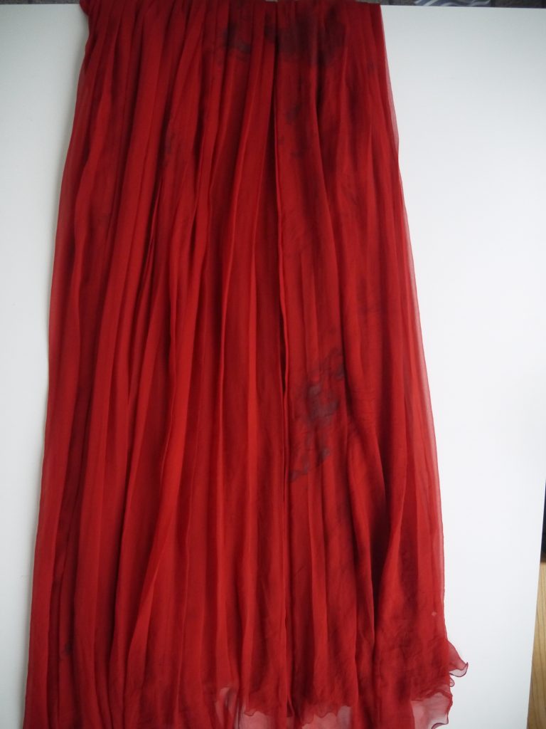 今回は、全体にシミ汚れが広がり、さらにプリーツ(ヒダ)が一部消えてしまった状態のドレスをお預かりしました。